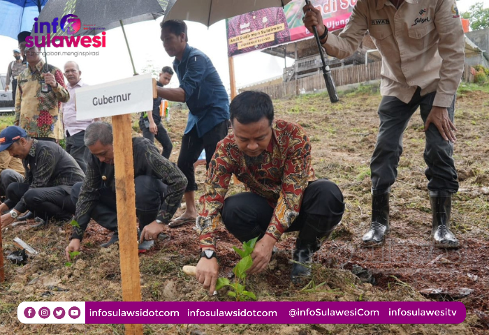INFOSULAWESI.com, WAJO -- Gubernur Sulawesi-Selatan Andi Sudirman Sulaiman melakukan penanaman 1 juta bibit murbei secara simbolis di Desa Ujung, Kecamatan Tanasitolo, Kabupaten Wajo, Kamis, 4 Mei 2023. Penanaman perdana ini dilakukan bersama Bupati dan Wakil Bupati Wajo, Amran Mahmud dan Amran bersama Forkopimda, merupakan bantuan Keuangan Provinsi Tahun 2023.