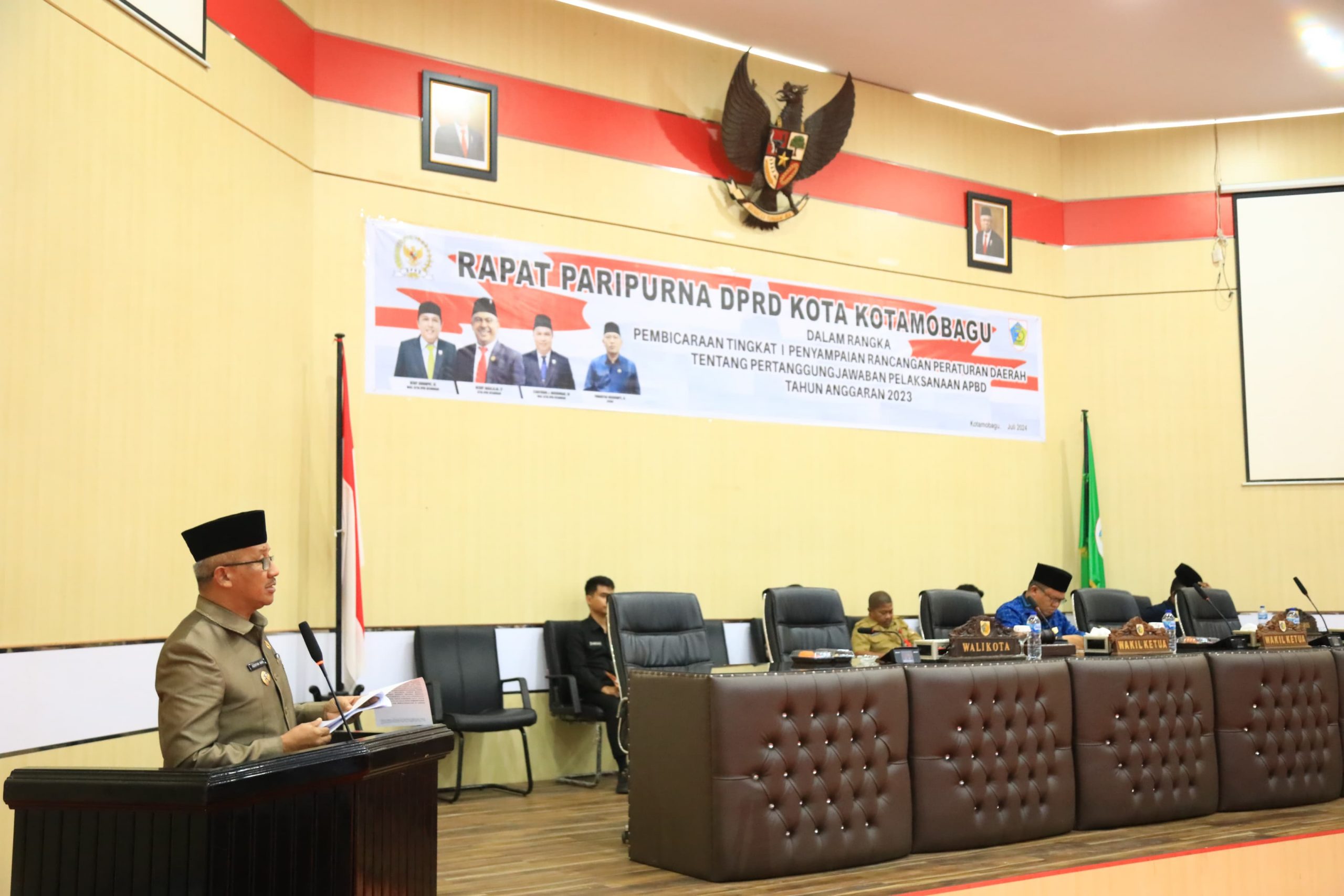 INFOSULAWESI.com KOTAMOBAGU – Penjabat (Pj) Wali Kota Kotamobagu, Dr. Drs. Hi. Asripan Nani, M.Si, menyampaikan Rancangan Peraturan Daerah (Ranperda) tentang Pertanggungjawaban Pelaksanaan Anggaran Pendapatan dan Belanja Daerah (APBD) Tahun Anggaran 2023, Senin 1 Juli 2024.