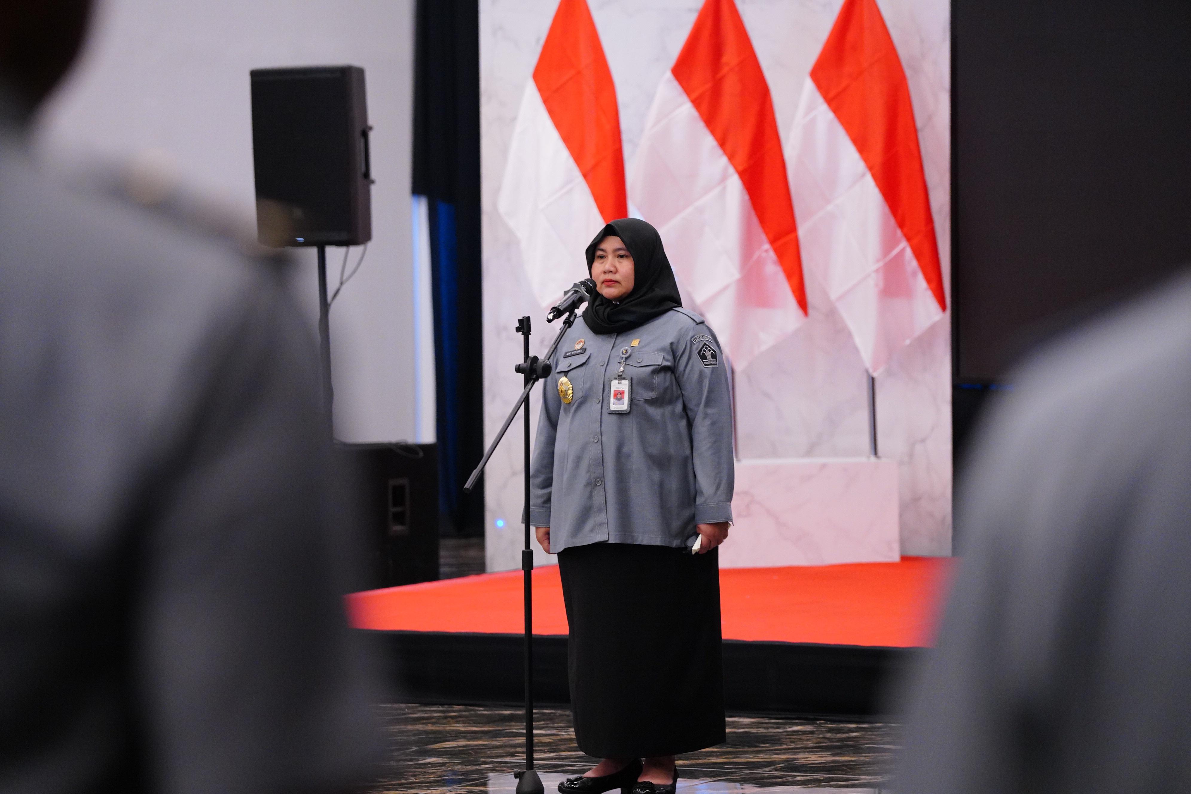 Kepala Divisi Peraturan Perundang - undangan dan Pembinaan Hukum, Heny Widyawaty, tampil percaya diri memimpin apel. Dengan tegas namun santai, dia mengingatkan pentingnya disiplin waktu bagi seluruh Aparatur Sipil Negara (ASN).