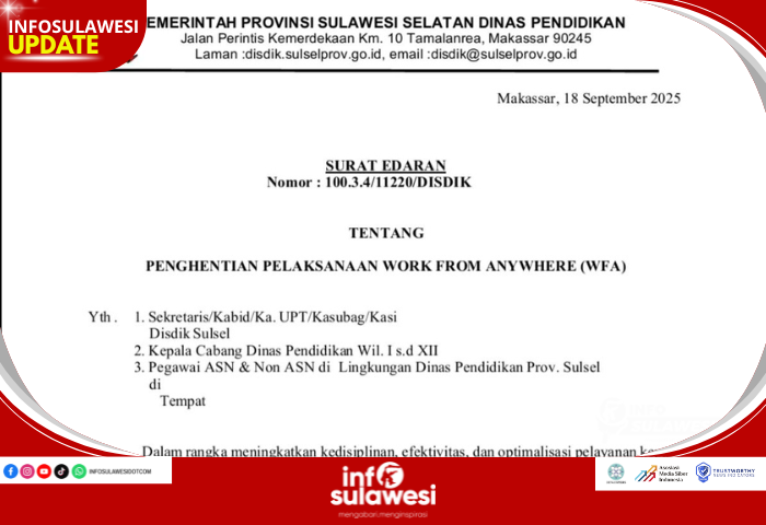 Terhitung mulai Tanggal 22 September 2025, kebijakan Work From Anywhere (WFA) di lingkup Dinas Pendidikan Provinsi Sulawesi Selatan Tidak Lagi Diberlakukan, dan mencabut surat Edaran WFA Nomor : 100.3.4/5006/DISDIK Tanggal 8 Juli 2025.
