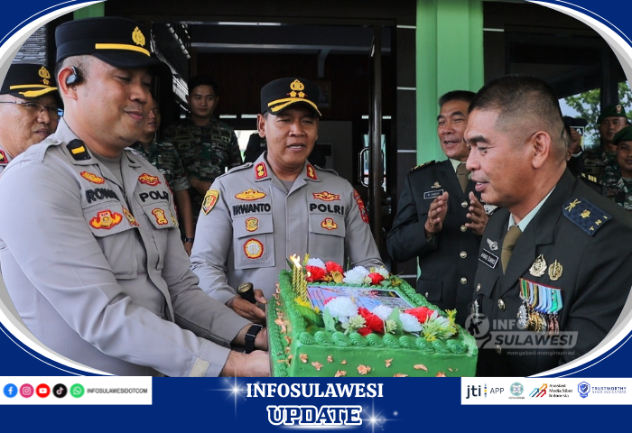 INFOSULAWESI.com KOTAMOBAGU - Kapolres Kotamobagu AKBP Irwanto, SIK,MH beri kejutan dihari ulang tahun TNI ke-80 di Markas Kodim 13030 Bolmong berupa tumpeng dan kue ulang tahun, Minggu 5 Oktober 2025.