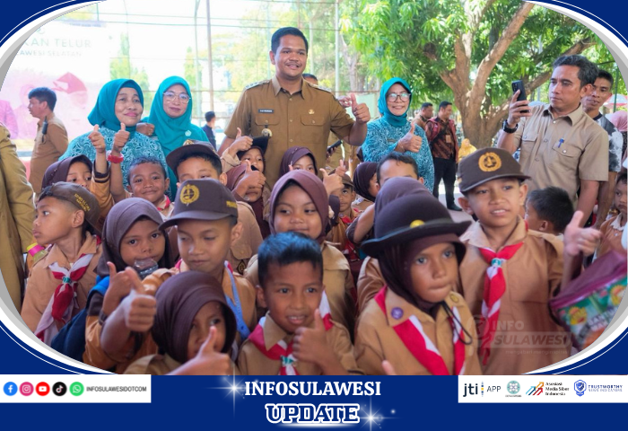 BANTAENG - Bupati Bantaeng, M. Fathul Fauzy Nurdin, berbaur dengan 400 siswa yang terdiri 350 siswa Sekolah Dasar dan 50 siswa Taman Kanak-kanak dalam pelaksanaan Gerakan Gemar Makan Telur, yang digelar di Lapangan Tenis Pelti Bantaeng, Jl. Raya Lanto, Selasa, 14 Oktober 2025.