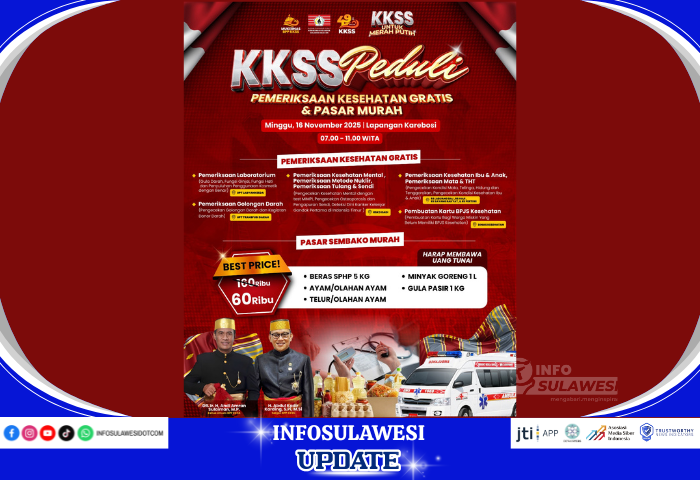 MAKASSAR -- Kerukunan Keluarga Sulawesi Selatan (KKSS) menggelar kegiatan sosial bertajuk “KKSS Peduli – Pemeriksaan Kesehatan Gratis & Pasar Murah” di Lapangan Karebosi, Makassar, pada Minggu, 16 November 2025. Acara berlangsung pukul 07.00 hingga 11.00 WITA dan terbuka untuk masyarakat umum.