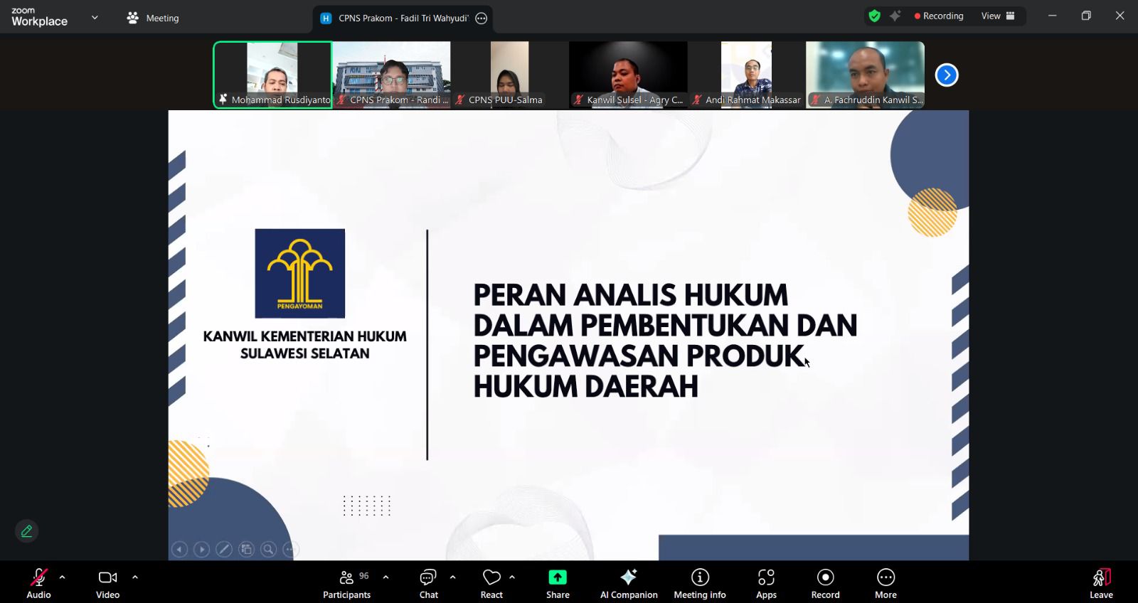 Kegiatan yang digelar virtual ini menghadirkan narasumber Mohammad Rusdiyanto Muin, Analis Hukum Madya Kanwil Kemenkum Sulsel, yang menyampaikan pentingnya peran analis hukum dalam memastikan kualitas penyusunan peraturan dan efektivitas implementasi produk hukum daerah.