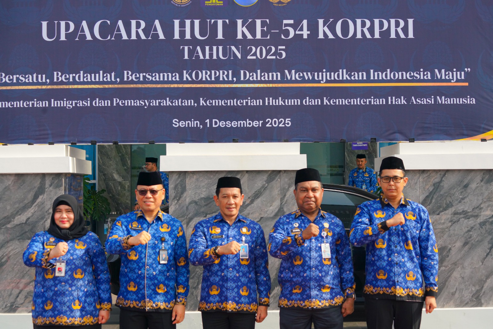 Makassar - Momentum peringatan Hari Korps Pegawai Republik Indonesia (KORPRI) ke 54 kembali digelar dengan melaksanakan upacara. Empat Kantor Wilayah (Kanwil), diantaranya Kanwil Kementerian Hukum (Kemenkum) Sulawesi Selatan (Sulsel), Kanwil Kementerian Hak Asasi Manusia (KemenHAM) Sulsel, Kanwil Direktorat Jenderal Imigrasi (Ditjenim) Sulsel, dan Kanwil Direktorat Jenderal Pemasyarakatan (Ditjenpas) Sulsel kompak melaksanakan upacara yang digelar di halaman kantor, Senin (1/12/2025).