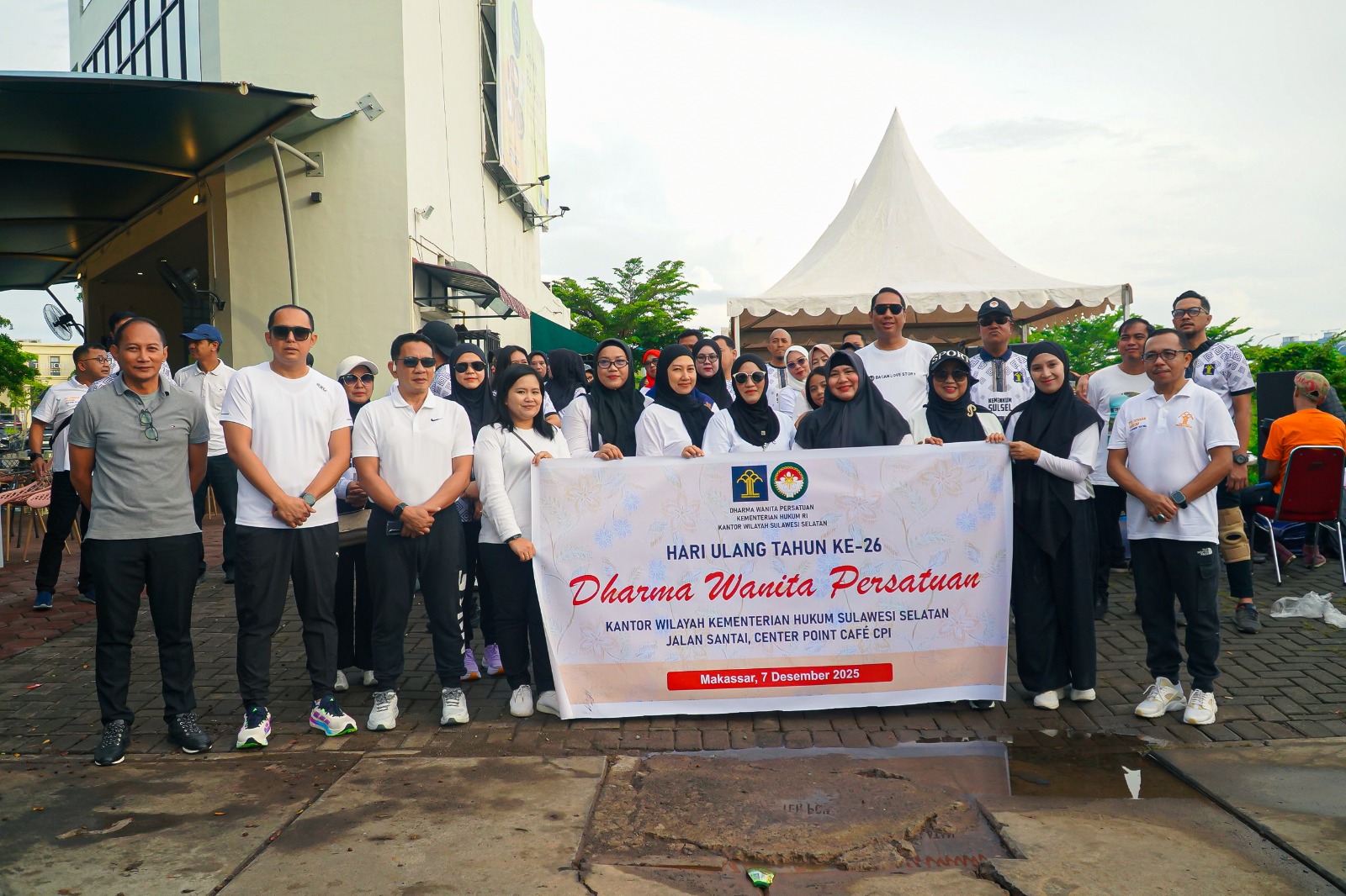 Makassar - Dharma Wanita Persatuan (DWP) Kantor Wilayah Kementerian Hukum Sulawesi Selatan (Kanwil Kemenkum Sulsel) tampil menonjol dalam kegiatan Jalan Sehat yang digelar pada rangkaian Layanan Hukum Car Free Day (Lankum Carady), Minggu, (07/12/2025). Kehadiran DWP tidak sekadar sebagai peserta, tetapi sebagai elemen penggerak yang turut memperkuat citra pelayanan publik Kanwil Kementerian Hukum di tengah masyarakat.