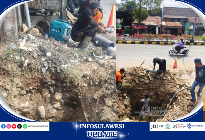 PALOPO -- Penanggulangan kebocoran pipa layanan Wara Timur di Jl. Andi Djemma (samping Alfamidi Super Binturu), distribusi air kepelanggan mengalami gangguan.
